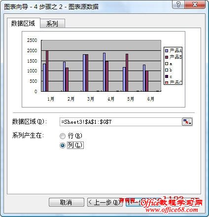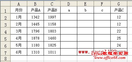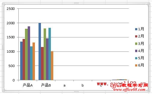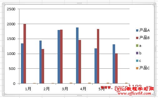 2.选择数据区域中的某个单元格,单击菜单“插入→图表→柱形图”,由于默认系列产生在“行”,需要将其修改为“列”,单击“下一步”,在“数据区域”选项卡中将“系列产生在”选项设置为“列”,单击“完成”。 3.参照方法一,将系列“b”、“c”和“产品C”绘制在次坐标轴,完成图表。 Excel 2007/2010: 1.在D列左侧插入三个空白列,并在每个空白列的第一行输入名称,如“a”、“b”、“c”等。 2.选择数据区域中的某个单元格,在功能区中选择“插入→柱形图→簇状柱形图”,插入一个柱形图。 3.在“图表工具-布局”选项卡的“数据”组中单击“切换行/列”,让系列产生在列。 4.参照上述方法将系列“b”、“c”和“产品C”设置在次坐标轴,并删除图例中的“a”、“b”、“c”三项即可