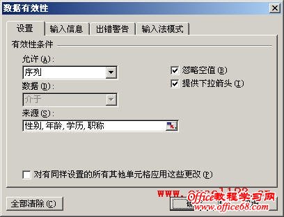 1.设置下拉列表。设置下拉列表的方法有很多,这里用数据有效性来设置。选择某个单元格,如T14,单击菜单“数据→有效性→设置→序列”,在“来源”下输入“性别,年龄,学历,职称”(不含引号)后确定,这样就在T14单元格中通过数据有效性设置了一个下拉列表。