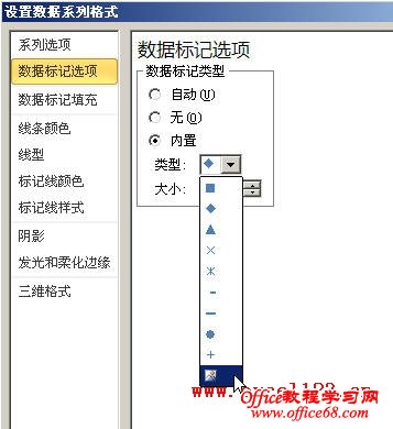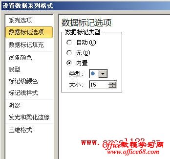 2.调整图片大小。选择“数据标记选项”,然后根据需要选择一个适当的类型和大小,本例为圆形,大小为“15”。