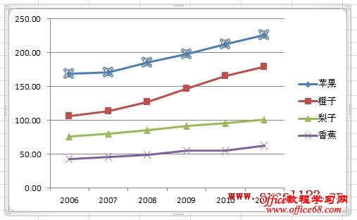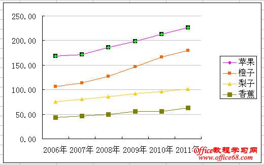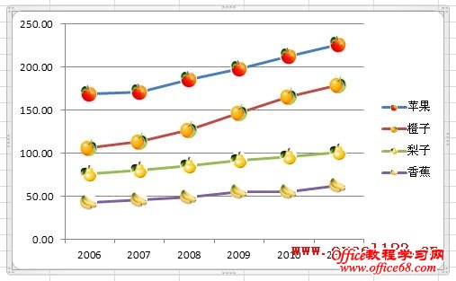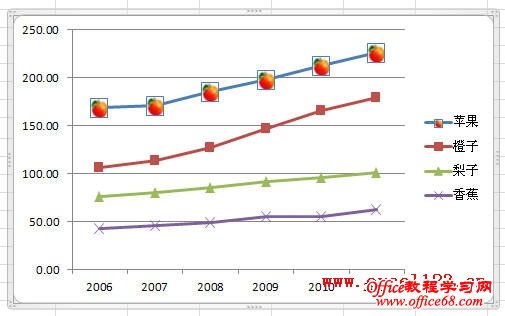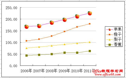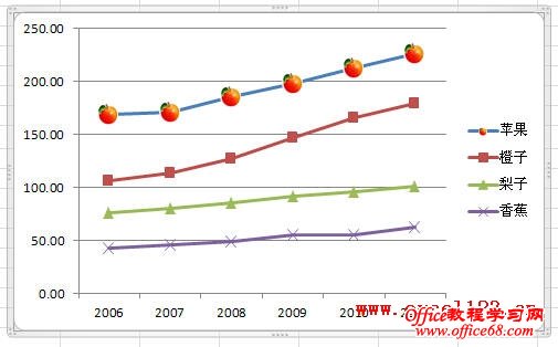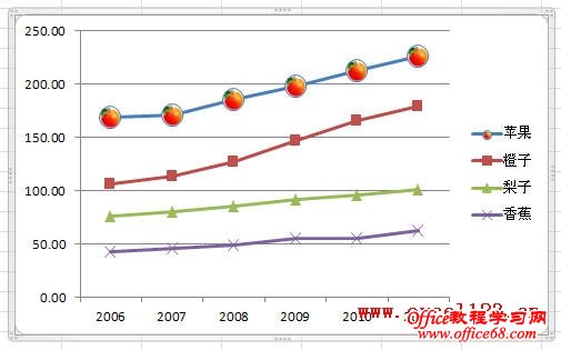 Excel 2003没有提供直接的方法将数据标记设置为自定义图片,可以采用插入自定义图片或复制粘贴的方法。假如下图为某地区近几年一些水果的销量折线图,以把其中“苹果”系列的数据标记更改为苹果图片为例,步骤如下: