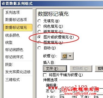 2.在对话框中选择“数据标记填充→图片或纹理填充”,单击“文件”按钮,在弹出的对话框中选择自定义的图片。