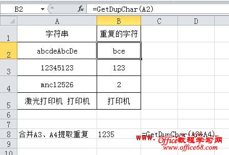 有时需要将Excel单元格内字符串中的重复字符提取出来,例如提取字符串“abcdeAbcDe”中重复的几个字符“bce”,如图所示,可以用自定义函数实现。