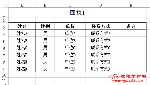 如图所示,会议回执在工作簿的第一个工作表中,参会人员信息从第4行开始填写,共5列,各个单位的参会人员可能不同。汇总工作簿与回执工作簿具有相同的行标题。