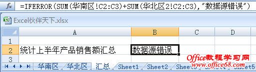 =IFERROR(SUM(华南区!C2:C3)+SUM(华北区2!C2:C3),"数据源错误") 按回车键即可返回计算结果。根据错误返回指定的值“数据源错误”。因为工作簿中没有“华北区2”工作表,所以 SUM(华南区!C2:C3)+SUM(华北区2!C2:C3) 返回错误值,IFERROR函数根据错误返回指定的值。IFERROR函数是公式计算出错则返回指定的值,否则返回公式结果。使用IFERROR函数来捕获和处理公式中的错误。 IFERROR函数是Excel2007新增的逻辑函数,基本功能与语法如下: