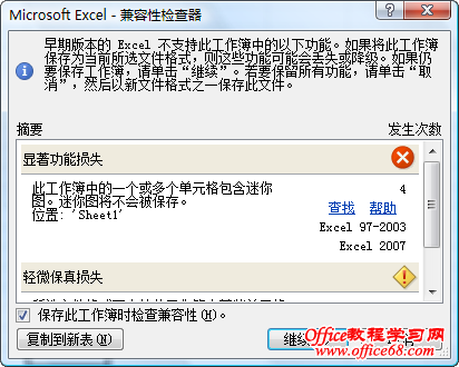 在Excel 2007/2010中,当保存工作簿为Excel 97-2003 文件格式 (.xls)时,如果工作簿中存在Excel 2003不支持的功能,如Excel 2010中新增的函数、Excel 2003不支持的单元格样式等,兼容性检查器对话框会自动出现,提示有哪些功能会显著损失或轻微损失,如下图。 要在保存Excel 2003格式工作簿时不显示该对话框,只需取消对话框中的“保存此工作簿时检查兼容性”选项即可。但该设置仅对当前工作簿有效,Excel并未提供一个取消或显示上述对话框的选项使其适用于所有工作簿。 如果以后在保存文件时要显示该对话框,或需要对工作簿进行兼容性检查,可用下面的方法。 Excel 2007:依次单击“Office按钮→准备→运行兼容性检查器”。 Excel 2010:依次单击“文件→信息→检查问题→检查兼容性”。 |