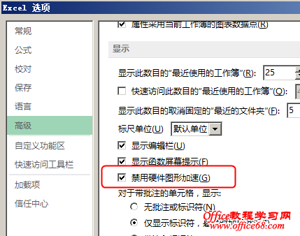 Excel 2013安装在配置较低的电脑中时,可能会出现响应较为缓慢的情况。比如一台多年前购置的电脑,显卡为Geforce FX 5200,在Win7+Excel 2013中双击单元格,有时要经过好几秒钟才能进入编辑状态,同时光标的移动也极不流畅,比鼠标的移动速度要慢好多,显得很卡;在单元格中输入公式回车后有时也不能立即得到结果,等等。这些情况在同配置电脑的Excel 2010中并不存在。如果出现这种情况,不妨试下禁用“硬件图形加速”,方法是: 在Excel 2013中,依次单击“文件→选项→高级”,在“显示”下勾选“禁用硬件图形加速”后确定。 这样设置后,上述问题可得到解决 |