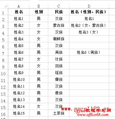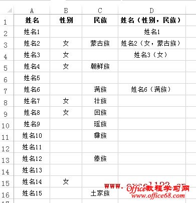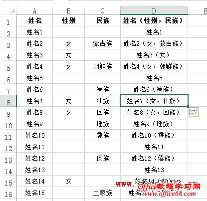 本例中B:D列各行中有的为空,有的包含文本,但只出现了四种情况,正如上图所示。因而只需在E列中输入上述几种示例,告诉Excel怎样去处理,再进行快速填充即可。 例㈡: 下图A:C列为“姓名”、“性别”和“民族”,需要在D列将其合并为“姓名(性别,民族)”的形式,但分下列几种情况: ① “民族”为“汉族”,“性别”为“男”的人员只列出姓名,如D2。 ② “民族”为少数民族,“性别”为“男”的人员列出姓名和民族,民族放到姓名后的括号内,如D7。 ③ “民族”为“汉族”,“性别”为“女”的人员列出姓名和性别,性别放到姓名后的括号内,如D4。 ④ “民族”为少数民族,“性别”为“女”的人员列出姓名、性别和民族,性别、民族放到姓名后的括号内,用逗号隔开,如D3。 首先要说明的是,用公式可以实现这一需求,但鉴于本文的主题,这里介绍用快速填充的方法来实现: 1.由于合并后的文本中不包含“汉族”和“男”字样,因而先将B:C列中的“汉族”和“男”字样替换为空。方法是选择B:C列,按Ctrl+H,打开“查找和替换”对话框,先在“查找内容”后输入“汉族”,“替换为”保留为空,单击“全部替换”按钮。用同样方法将“男”替换为空。 2.在D列相应的单元格输入上述四种情况的示例。 3.选择D列填充区域的某个单元格,在“数据”选项卡中单击“快速填充”完成各行的合并。 |