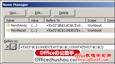 示例3:基于给定数目创建动态区域 可以使用INDEX函数创建动态区域。在本例中,已经使用下面的公式创建了名称为MonthList的命名区域: =’Ex03′!$C$1:INDEX(‘Ex03′!$C:$C,COUNTA(‘Ex03′!$C:$C))