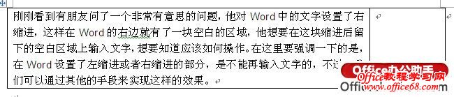 对Word中的文字设置了右缩进,这样在Word的右边就有了一块空白的区域,他想要在这块缩进后留下的空白区域上输入文字,想要知道应该如何操作。在这里要强调一下的是,在Word设置了左缩进或者右缩进的部分,是不能再输入文字的,不过,我们可以通过其他的手段来实现这样的效果。 方法一:通过Word表格 1、在Word中插入一个一行两列的表格,用鼠标调整单元格的宽度,将右侧单元格的宽度调整为右缩进的大小。 2、复制(或剪切)Word正文的内容,粘贴到表格左侧的单元格。