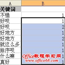 3、拖动2中的公式应用到下面剩余的单元格中,重复出现的词旁边单元格的值变为2,否则就是1: