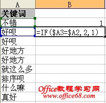 2、然后把旁边一列当辅助列,第一空格打进1,第二空格打入公式:=if($a3=$a2,2,1),然后按下回车键就行(小tips:if函数的中的各个值的意义是这样的=if(逻辑式值,为真时的值,为假时的值),用英语表示可能清楚一点:=if(logic_value,value_if_true,value_if_false)):