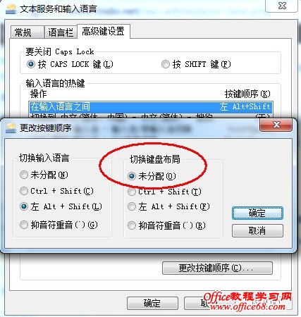 三、 问题与设置:Shift+Ctrl+0(零)——快捷键失效的处理办法 3.1 修改输入法的快捷键设置,调整快捷键的冲突: 打开控制面板 选定“更改键盘或其他输入法” 选择“键盘和语言”标签,点击“更改键盘…”按钮,在弹出的对话框中选择“高级键设置”,再选择“更改按键顺序…”,在“切换按键布局”中取消CTRL + SHIFT,选择“未分配”即可。