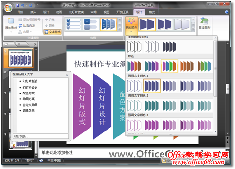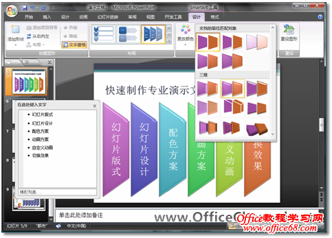 图6 SmartArt的平面与三维效果 针对于演示文档中的文字、图形和图片,PowerPoint 2007提供了大量快速、智能格式化处理的工具和手段,让您不需要借助任何第三方工具,就可以制作出炫光惊艳的专业演示文稿,如图7所示。