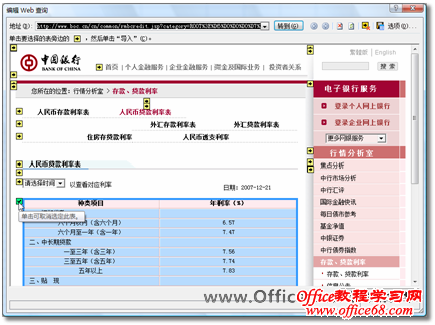 以往我们在引用网页上的数据时,往往总是不辞辛苦地从网页上复制、然后粘贴到Excel工作簿,然后调整列宽,再做一些美化工作,当网页上的数据更新时,我们不得不对工作表重新进行修改。其实,这些繁琐的工作完全可以交给Excel 2007来完成。 利用Excel导入外部数据可以使数据的获取更加高效和准确。 (1)在Excel中打开“数据”选项卡,单击“获取外部数据”选项组中的【自网站】按钮,打开“新建Web查询对话框”。 (2)在“地址”栏中输入数据源所在的网址。 (3)单击【转到】按钮打开网页。 (4)将鼠标指针移动到希望导入的数据区域的左上角,选中“