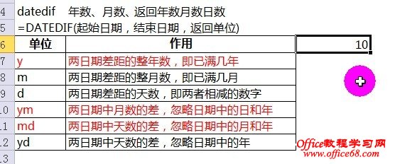 月数差:=DATEDIF(A3,B3,"ym"),返回11;解读:ym,从6月算起,到下一年6月,期间共12个月,相减的话就是11(如1到3,一共3,相减就是2)。