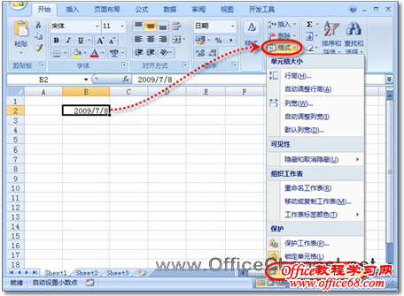 1)在单元格中输入“2009/7/8”,并选中该单元格。在“开始”选项卡的“单元格”选项组中,执行格式|【设置单元格格式命令,如图2所示。