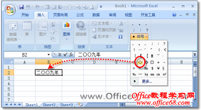 打开Excel 2007工作簿,在“插入”选项卡的“特殊符号”选项组中,单击【符号】按钮,在下拉列表框中选择“○”插入即可,如图1所示。