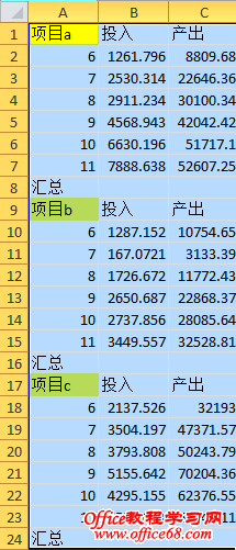 大家觉得如何能快速对他们进行求和呢。当然,这里我只是选取了3个项目的计算。如果10个,100个又该如何计算。 有人说,我不知道好方法,慢慢去一个个算吧。 有人说,可以用透视表,但是这数据首先要改进成透视表源数据的结构。 我的方法是,选中b1:c24,然后F5定位,选择空值。最后点击自动求和或者快捷键alt+=。神奇的事发生了。哈哈