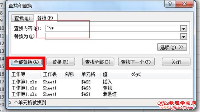 通配符中?代表1个未知字符,~?这属于问号前加个波形符,才代表查找?。加个意思*就是查找问号之后的全部,点全部替换也能得到同样的结果 第三种是函数方法。虽然看似有点麻烦,其实却是最通用的,灵活性强。=LEFT(A1,FIND("?",A1)-1),一个查找函数find加一个截取函数。关于这两个函数在函数入门教程中有比较详细的解答。 |