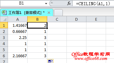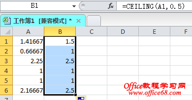 稍微解释下这个函数ceiling的语法结构。=ceiling(单元格,要舍入到的倍数),单元格这里就是A1,要舍入的倍数是1时,才能返回整数。假设我们改成=ceiling(a1,0.5)得到结果就会这样 可以看到得到都是正方向增加到为0.5的倍数。 |