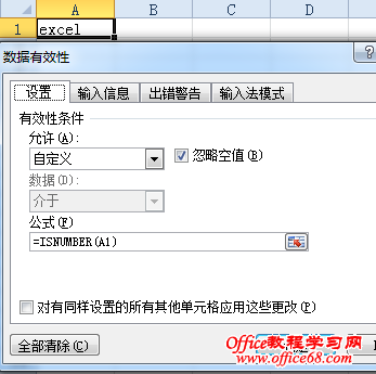 今天一个教程客户,问我如何设置数据有效性来实现限制文本的输入,只能输入文字。我想了下,其实挺简单的。看过教程的朋友都知道,istext是判断是不是文本,而isnumber是判断是不是数值。如果输入数字,则isnumber得到true,否则返回false。