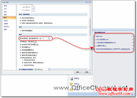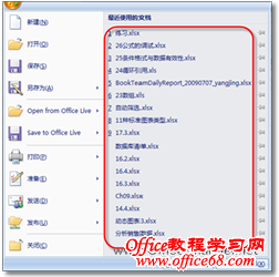当使用Excel 2007打开多个工作簿后,单击【Office按钮】,在下拉菜单右侧会显示“最近使用的文档”列表,如3所示。默认情况下该列表的数目为17,用户也可以将其更改为从150之间的任意数值。