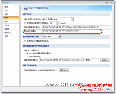 在“Excel选项”对话框中,单击左侧导航栏中的【保存】按钮,在“保存工作簿”选项区域的“默认位置”文本框中键入指定的保存路径,如5所示。单击【确定】按钮,默认的存储路径便设置完成了。