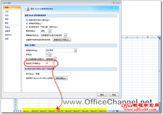 单击【Office按钮】,在随即打开的下拉菜单中单击【Excel选项】按钮,打开“Excel选项”对话框,单击左侧导航栏中的【常用】按钮,在“新建工作簿时”选项区域,将“包含的工作表数”微调按钮调到“10”,单击【确定】按钮。