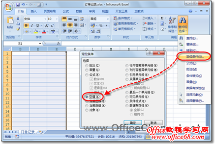 2 隐藏选中单元格所在列 (4)选中整个工作表,然后在“编辑”选项组中,单击【查找和选择】按钮,在随即打开的下拉列表中,执行【定位条件】命令,打开“定位条件”对话框,在对话框中选择“空值”单选按钮,如图3所示。设置完成后,单击【确定】按钮,关闭对话框。