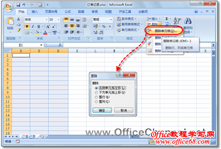图3 选择空白列 (5)在“单元格”选项组中,单击【删除】下三角按钮,在随即打开的下拉列表中执行【删除单元格】命令,打开“删除”对话框,如图4所示。