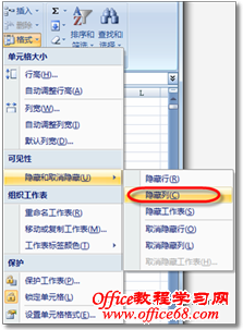 (3)在“单元格”选项组中,单击【格式】按钮,在随即打开的下拉列表中,执行【隐藏和取消隐藏】|【隐藏列】命令(如图2所示),即可将选中单元格所在列隐藏。