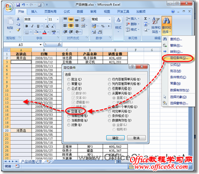 在使用Excel录入数据时,为了节省时间,用户可能简化了一些内容的录入,例如,当需要输入的内容与上一行相同时便不再重复录入。但是,在某些情况下,因数据分析的需要,又必须填充这些空白单元格,当表格中的数据非常庞大时,如何才能高效地完成这一任务呢?下面就介绍一种简单的操作技巧,具体操作步骤如下。 (1)打开包含空白单元格的数据表格。 (2)选中包含空白单元格在内的整个数据区域,然后在“开始”选项卡的“编辑”选项组中,单击【查找和选择】按钮,在随即打开的下拉列表中,执行【定位条件】命令,打开“定位条件”对话框。 (3)在对话框中选择“空值”单选按钮,然后单击【确定】按钮,即可选中数据区域中所有空白单元格,如图1所示。