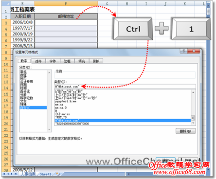 图1 输入域名相同的员工邮箱地址 (1)在输入员工邮箱地址前,首先选中“邮箱地址”列所在的单元格区域,并按【Ctrl】+【1】组合键打开“设置单元格格式”对话框。 (2)在“数字”选项卡的“分类”列表框中,选择“自定义”,然后在右侧的“类型”文本框中输入“@"@bticest.com"”(用户可以根据自己企业的邮箱地址,对自定义数字格式进行适当调整),如图2所示。