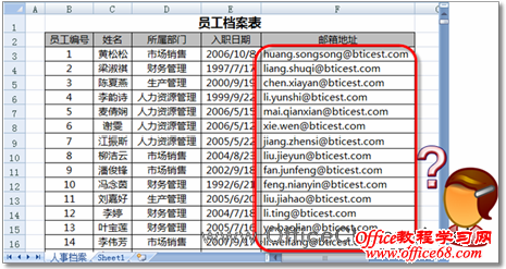 人事管理部门的人员,可能需要在员工档案表中录入员工的邮箱地址,由于很多企业的员工都使用统一的企业邮箱,因此这些邮箱地址的域名是相同的,如图1所示。如何在Excel中快速地输入这些有规律的邮箱地址呢?此时,可以按照如下步骤进行操作。