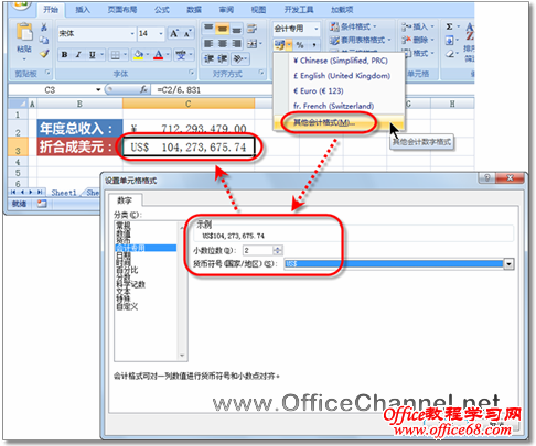 图1 默认货币为人民币 (2)选择美元数值所在的单元格,单击【会计数字格式】按钮右侧的下三角按钮,并从下拉列表中执行【其他会计格式】命令。然后,在“设置单元格格式”对话框中,“分类”列表框中的“会计专用”项默认已被选中,用户只需在“货币符号”下拉列表框中选择“US$”即可,并单击【确定】按钮,当前单元格的货币符号即可变为美元,如图2所示。