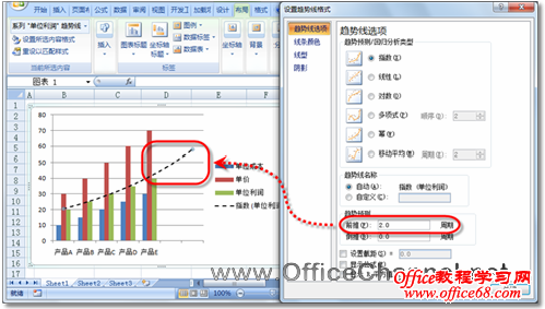 5)切换到“趋势线选项”选项卡,在“趋势预测”区域中,设置一个预期的“前推”值,例如“2”,此时,趋势线会根据现有数据预估出未来2个周期的趋势状态,如图5所示。