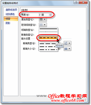 4)在“设置趋势线格式”对话框中,切换到“线型”选项卡,可以适当增加趋势线的“宽度”值,并选择一种更显眼的“短划线类型”样式,如图4所示。