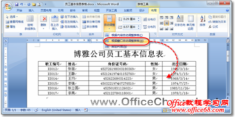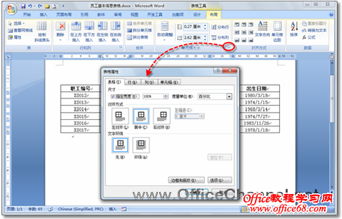 图3 根据窗口自动调整表格 “固定列宽”命令选项,可使表格中每个单元格保持当前尺寸,除非用户改变其尺寸。 (3)如果要精确改变表格的尺寸,可以在“布局”选项卡的“单元格大小”选项组中,单击【对话框启动器】按钮,在随即打开的“表格属性”对话框中根据需要对表格尺寸进行更改即可,如图4所示。