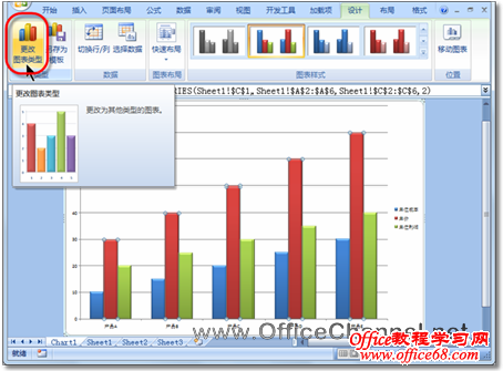 1)选中目标图表中的某个数据系列,并切换到“图表工具”的“设计”上下文选项卡,单击“类型”选项组中的【更改图表类型】按钮,如图1所示。