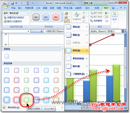 4)选择另外一个数据系列,切换到“图表工具”的“格式”上下文选项卡,为其增加一种用于突出显示的效果,例如在“形状样式”选项组中单击【形状效果】按钮,并在“发光”子列表中选择一种发光效果,如图4所示。