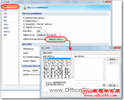 图1 在“Office下拉列表”中单击【Excel选项】按钮 (2)在打开的“Excel选项”对话框的“常用”选项卡中,单击【编辑自定义列表】按钮,打开“自定义序列”对话框,如图2所示。