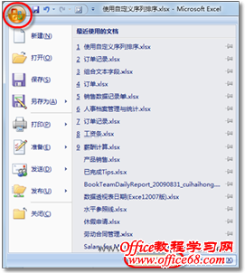 在数据透视表中,通过使用Excel提供的排序功能,可以方便快捷地按照某一规则升序或降序排列数据项,然而,当简单的升序或降序排序功能不能满足用户需求时,用户还可以使用自定义序列排序数据项,以达到某些特殊需求。 例如,在博雅公司的订单销售报表中,需要按“销售一部、销售二部、……、销售六部”的顺序排列数据项目。如果仅通过使用简单的升序或降序排列是不能达到此目的的,此时可以使用自定义序列来完成,具体操作步骤如下。 (1)在包含订单销售报表的Excel工作表,单击【Office】按钮,在随即打开的下拉列表中单击【Excel选项】按钮,如图1所示。
