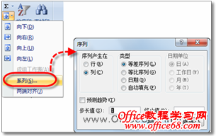 图2 执行【系列】命令打开“序列”对话框 (5)在对话框的“序列产生在”选项区域中,确保选中“列”单选按钮,在“类型”选项区域中选中“等差序列”单选按钮,在“步长值”文本框中输入“1”。 (6)单击【确定】按钮关闭对话框,系统将自动在选中的单元格区域中填充等差序列,如图3所示。