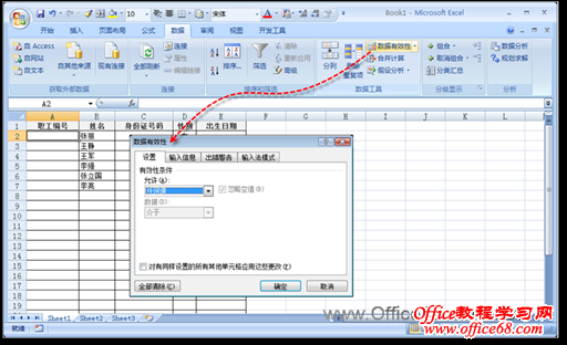 2)在“数据”选项卡的“数据工具”选项组中,单击【数据有效性】按钮,打开“数据有效性”对话框,如图1所示。
