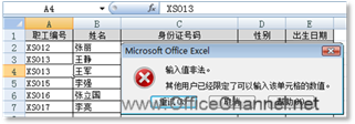 经过上述操作后,若在上述工作表的“A列”单元格中输入重复的职工编号,系统就会弹出提示对话框,禁止输入当前内容,如图3所示。