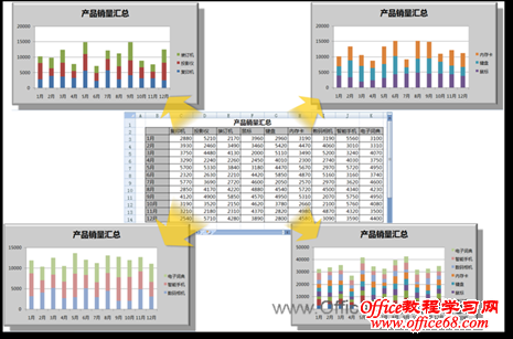 在使用图表分析数据时,有时可能需要根据实际情况,在图表中呈现不同的数据。例如,销售部门统计了3类商品的销售量,此时用户可能希望定制4种显示方案,分别在图表中显示办公用品类、电脑配件类产品、电子产品,以及全部的产品(如图1所示),如何在这几种不同的显示方案间进行切换呢?此时可以按照如下步骤进行操作。