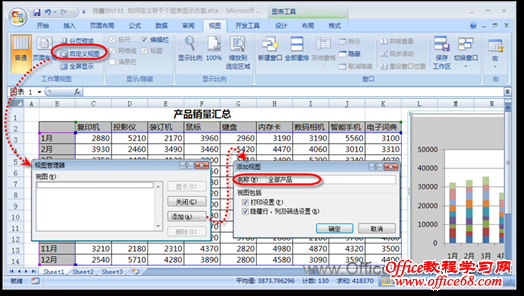 2)在“视图”选项卡的“工作簿视图”选项组中,单击【自定义视图】按钮,打开“视图管理器”对话框。单击对话框中的【添加】按钮,打开“添加视图”对话框。在“名称”对话框中,为当前的显示方案定义一个名称“全部产品”,如3所示,设置完成后单击【确定】按钮。
