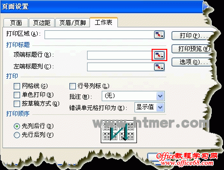 3、在弹出的“页面设置”窗口中切换到“工作表”选项卡,然后点击“顶端标题行”方框右边的红色小按钮,相关截图如下所示: