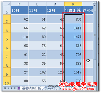 1. 首先,在销售数据表中选中存储“年度汇总”数据的单元格区域,如1所示。