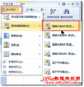 2. 然后,在“开始”选项卡的“样式”选项组中,单击【条件格式】按钮,并执行下拉列表中的【项目选取规则】|【值最大的10项】命令,如2所示。